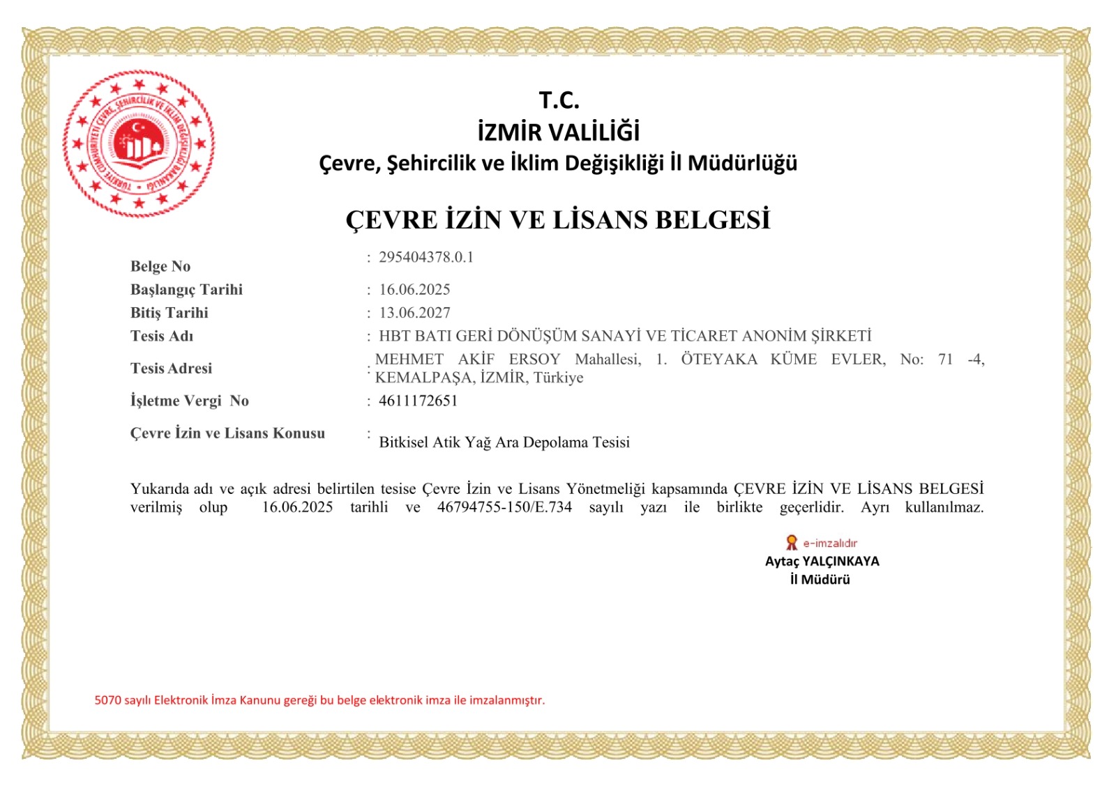 Kabul Edilen Atık Kodları: 20 01 25 (Yenebilir sıvı ve katı yağlar) ve 20 01 26* (20 01 25 dışındaki